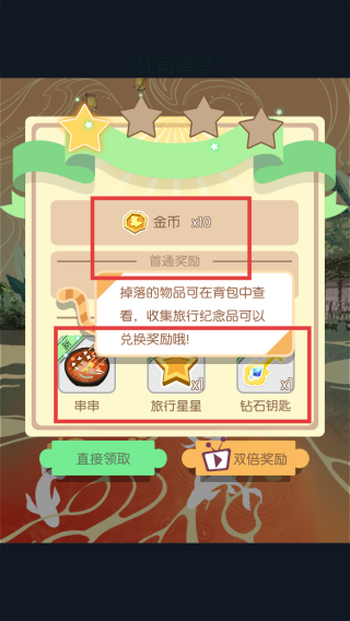 3、通关【杜甫草堂】关卡可获奖励,首通奖励有【金币x10】,还会掉落【串串】【旅行星星】【钻石钥匙】等物品,可在背包查看。