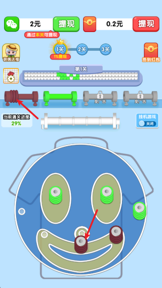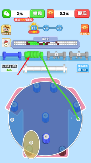 1、游戏中关卡上方有【提现】按钮,达到对应金额可提现。关卡有进度显示,如【当前通关进度43%】,可操控类似圆盘内的部件。