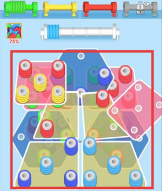 3、面对复杂盘面,如多个颜色和堆叠部件的情况,可有序规划操作步骤,合理利用上方不同颜色部件,完成关卡目标。
