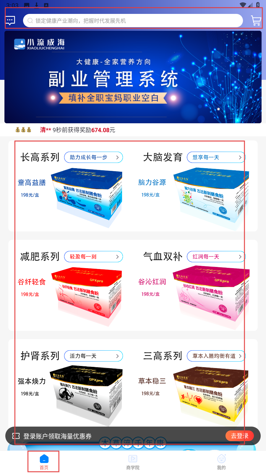 1、打开应用,在【首页】,浏览长高、减肥等产品系列,点击童高益膳等产品进详情。