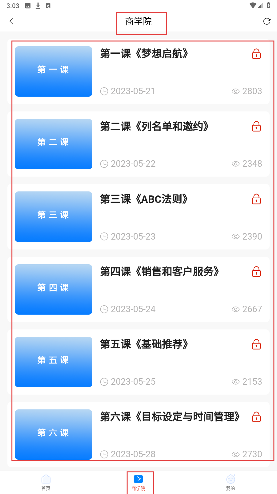 3、进入【商学院】页,选择《梦想启航》等课程,点击进入学习,完成课程浏览流程。