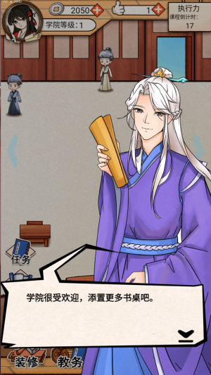 4、科举晋升目标:以培养门生考中进士为长期目标,激励玩家不断优化教学,提升学生实力,体验培养成功的喜悦。