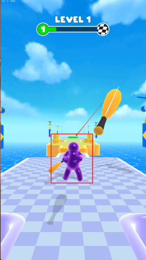2、操控躲避障碍:在赛道上通过触屏滑动,操控果冻人左右移动、跳跃翻滚,灵活躲避各类陷阱与障碍。