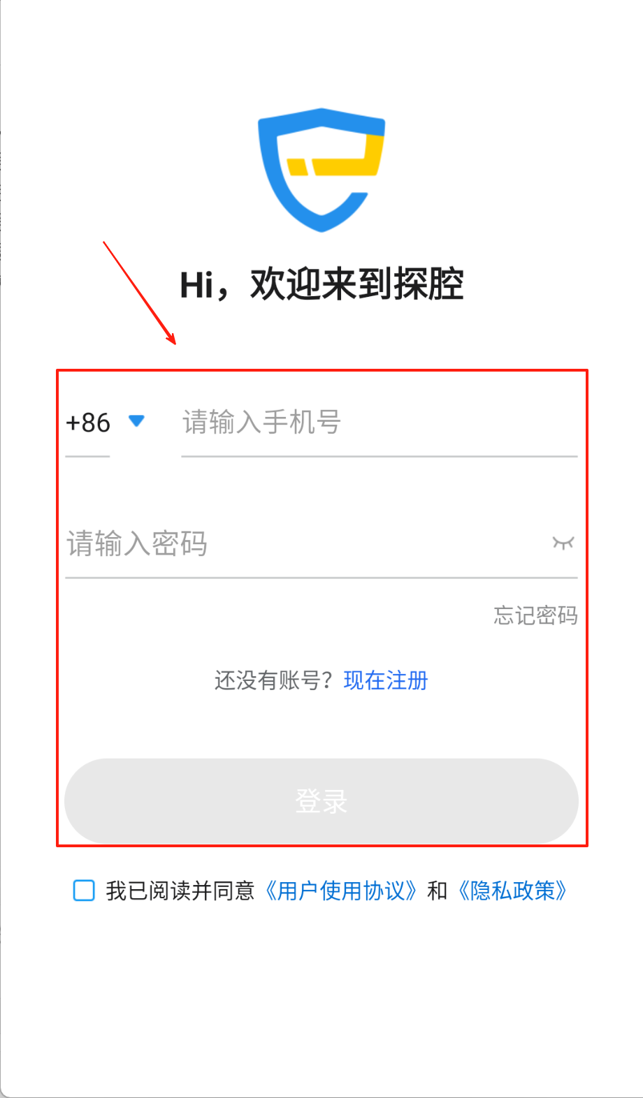 1、打开探腔进入登录页,选好+86地区代码输入手机号,点密码栏输入时可用小眼睛图标查看是否输对。