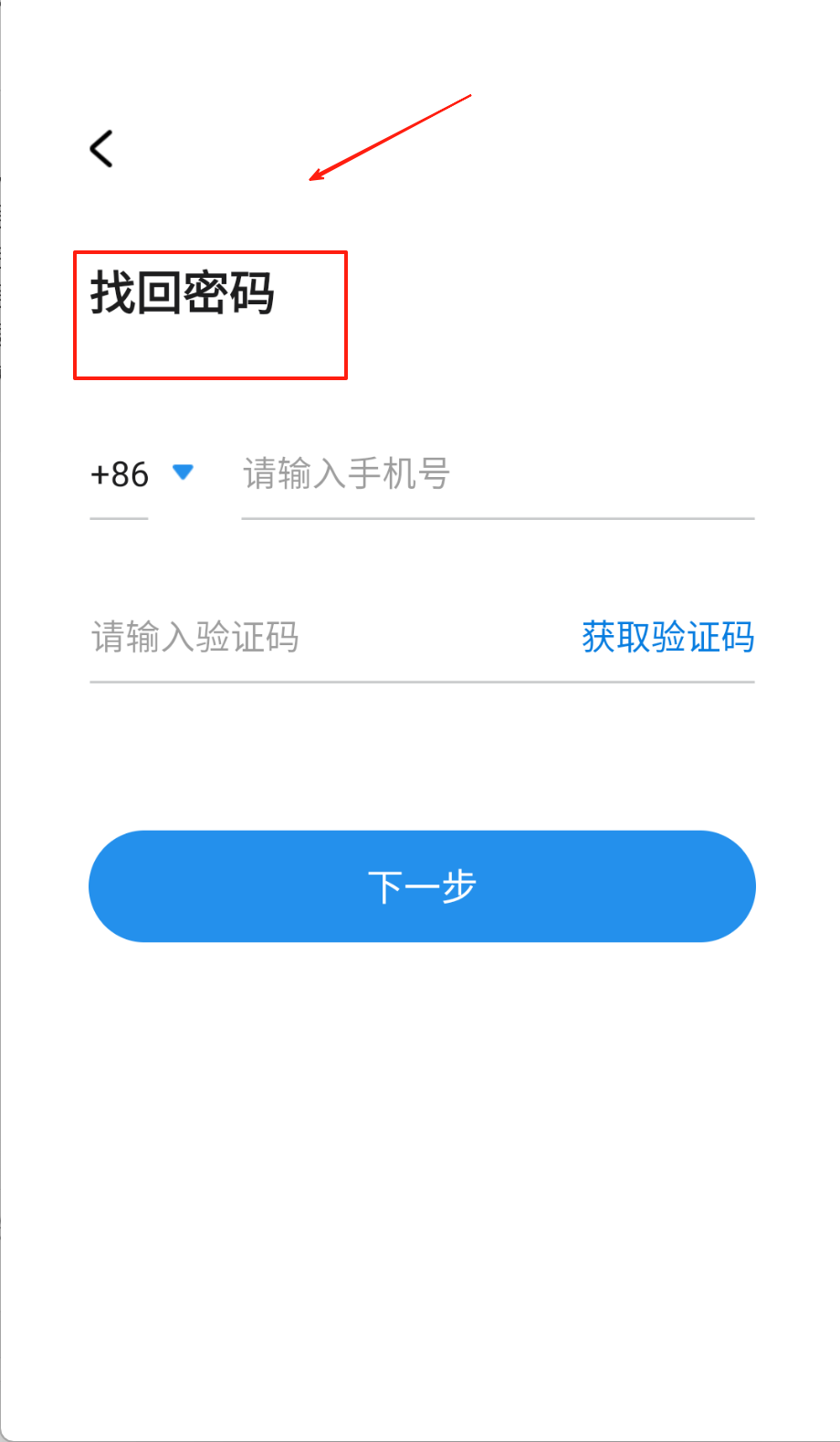 2、找回密码点界面上的提示字,填手机号后点蓝色获取验证码按钮,收到短信填好验证码,点下一步按提示重置新密码哦。