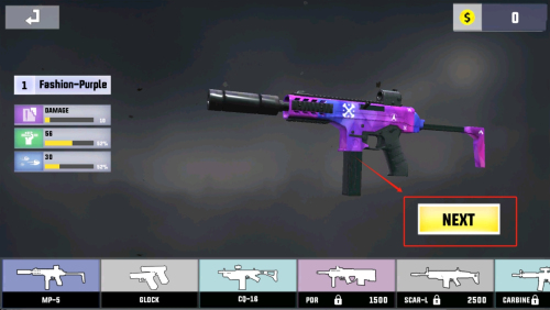 2、如何选择武器?在武器选择界面,浏览可用武器,点击“NEXT”按钮查看更多武器选项。