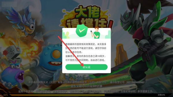 1、进入游戏,点击【去认证】。