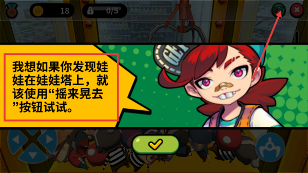 2、观察娃娃的分布,当发现娃娃在娃娃塔上时,按照提示点击“摇来晃去”按钮,尝试晃动娃娃,使其位置更便于抓取。