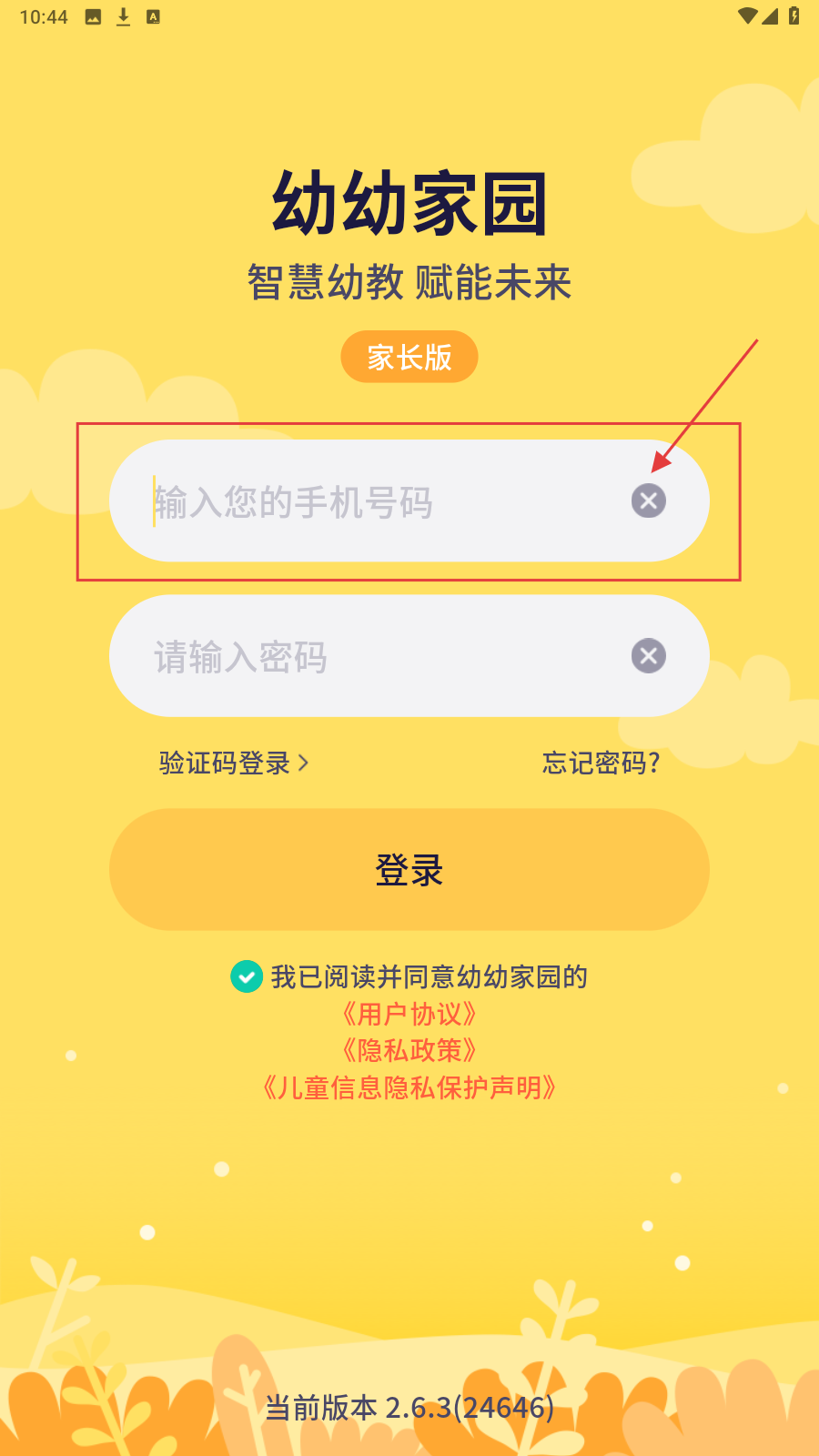 1、打开幼幼家园应用,进入登录页,在【输入您的手机号码】输入框,录入手机号。