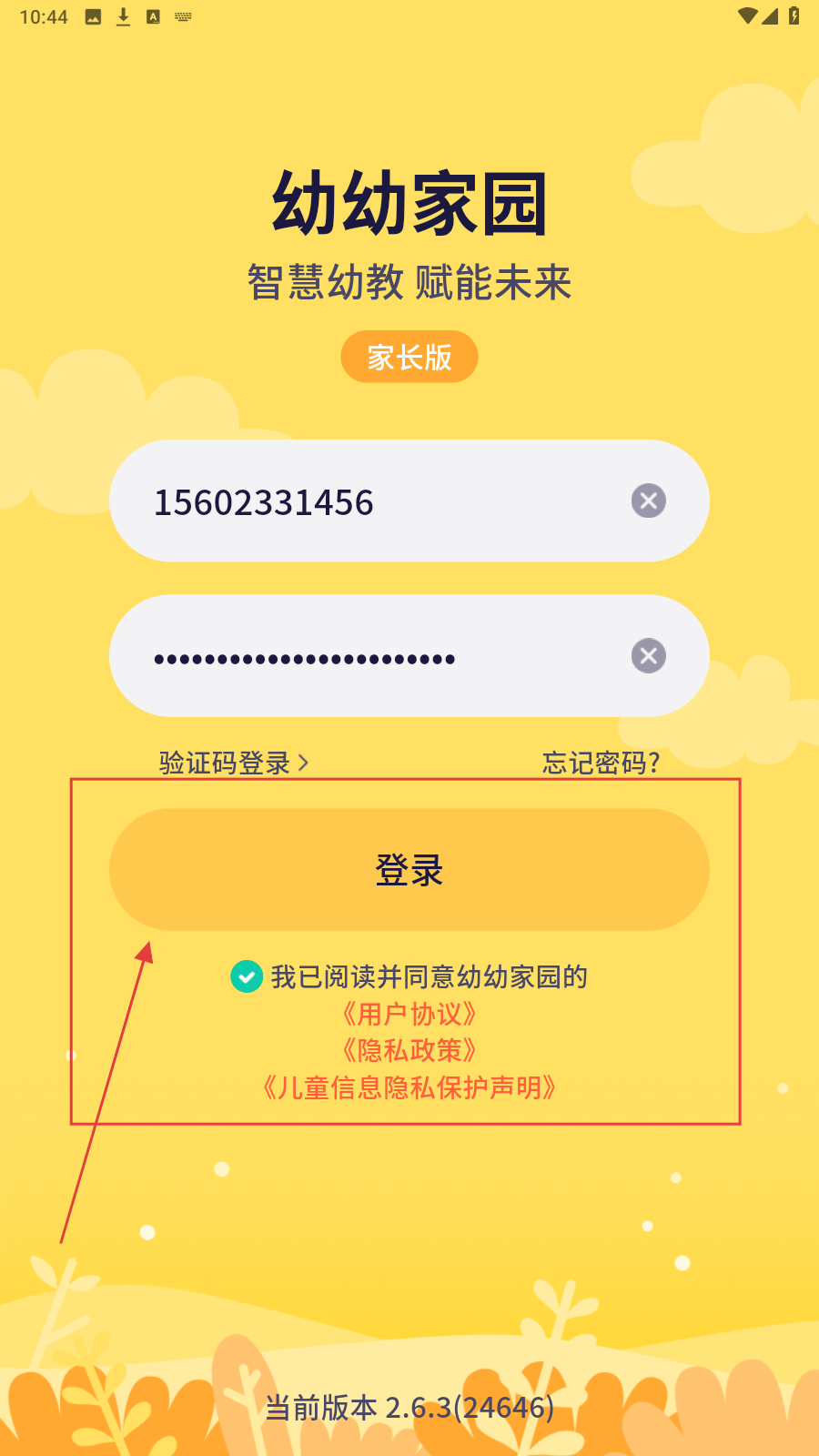 3、确认已勾选【我已阅读并同意幼幼家园的《用户协议》《隐私政策》《儿童信息隐私保护声明》】点击【登录】,完成应用登录流程。