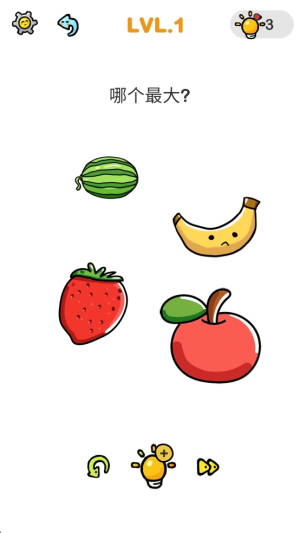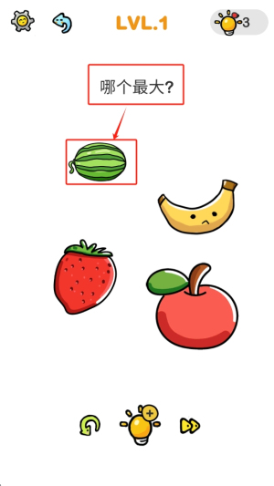 3、解答问题:在游戏关卡中,选择正确的答案,例如选择最大的水果,然后点击“确认”按钮。