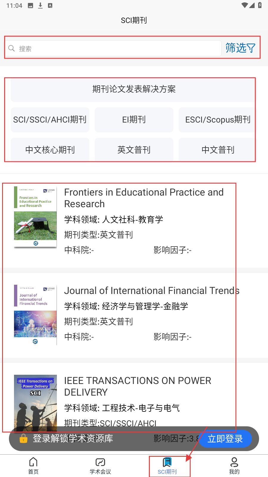 3、切换至【SCI期刊】页,利用搜索、筛选工具,选择期刊类型,查看期刊详情(学科领域、影响因子等),推进学术资源查找流程。