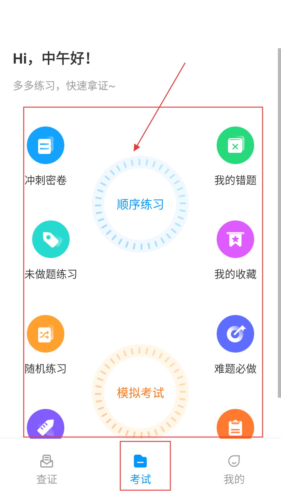 1、打开应用,进入【考试】页,选择练习模式(如顺序练习、冲刺密卷等),开展习题练习。
