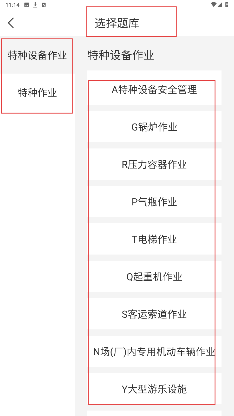 2、切换至【选择题库】页,选择分类,再选具体作业类型(如A特种设备安全管理等)。