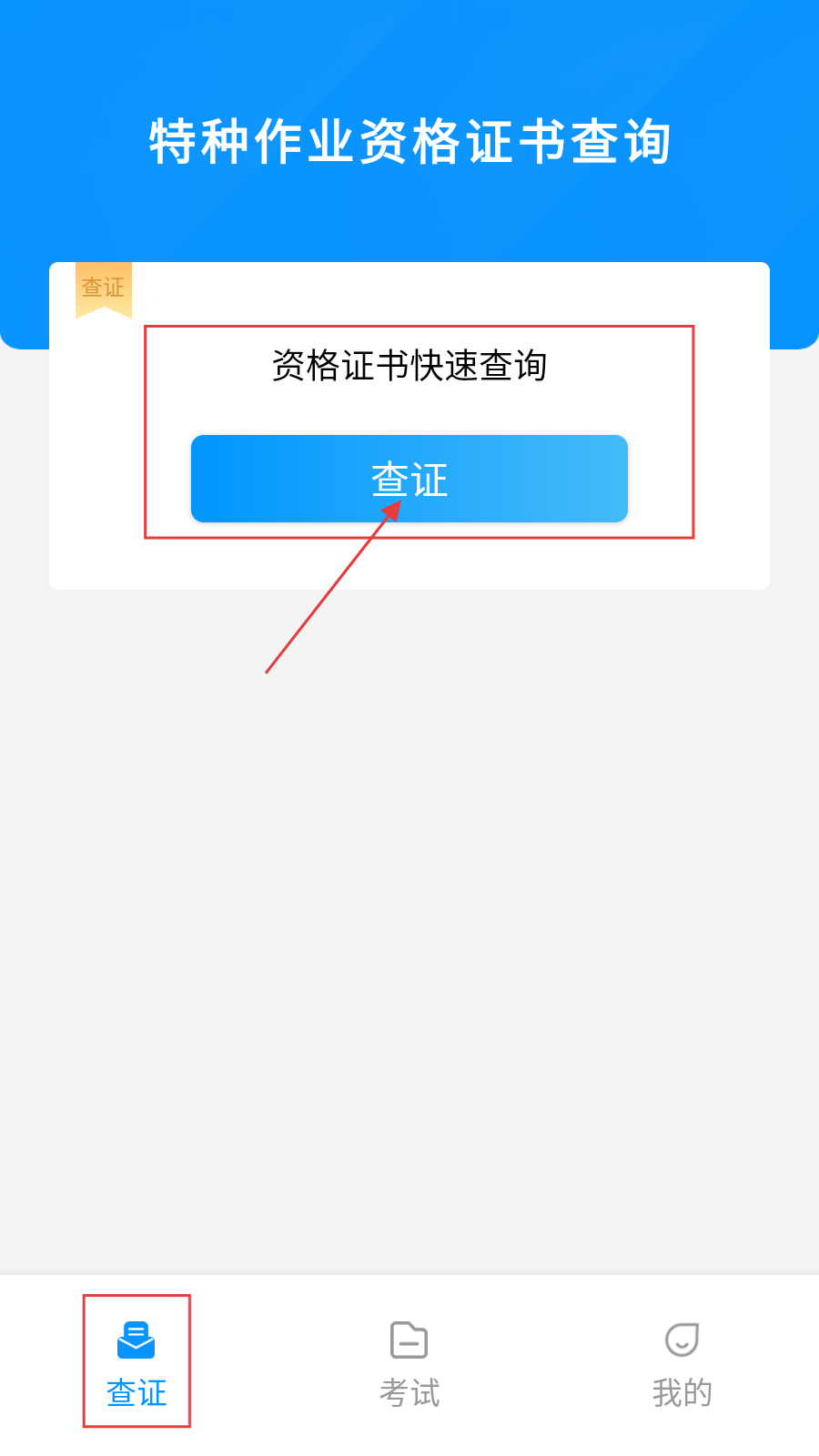 3、进入【查证】页,点击资格证书快速查询的【查证】按钮,进行证书查询,推进学习备考及证书查询流程。