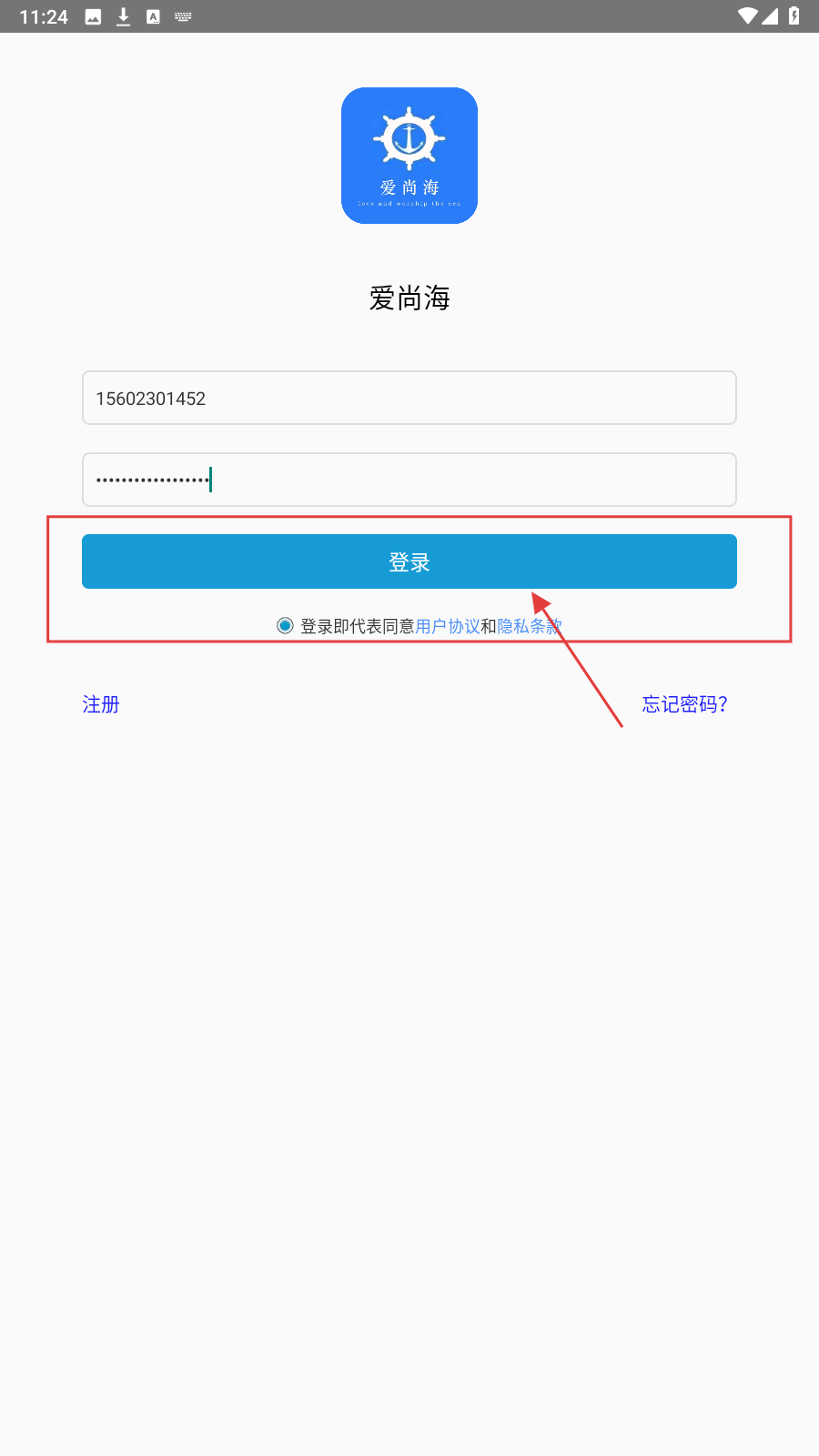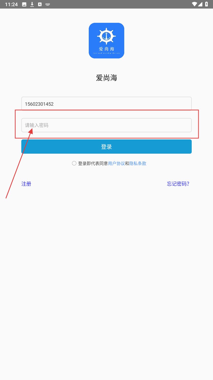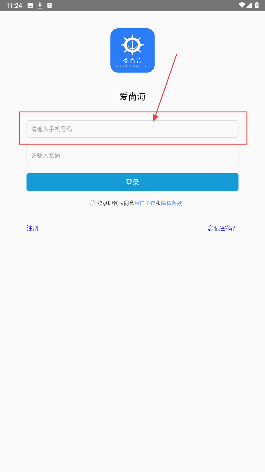 1、打开爱尚海应用,进入登录页,在【请输入手机号码】输入框,录入手机号。