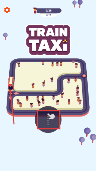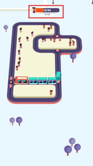 1、关卡开始时,长按屏幕控制火车移动,在轨道上收集乘客,留意上方进度条(如0/28、13/34),达到目标数量过关。