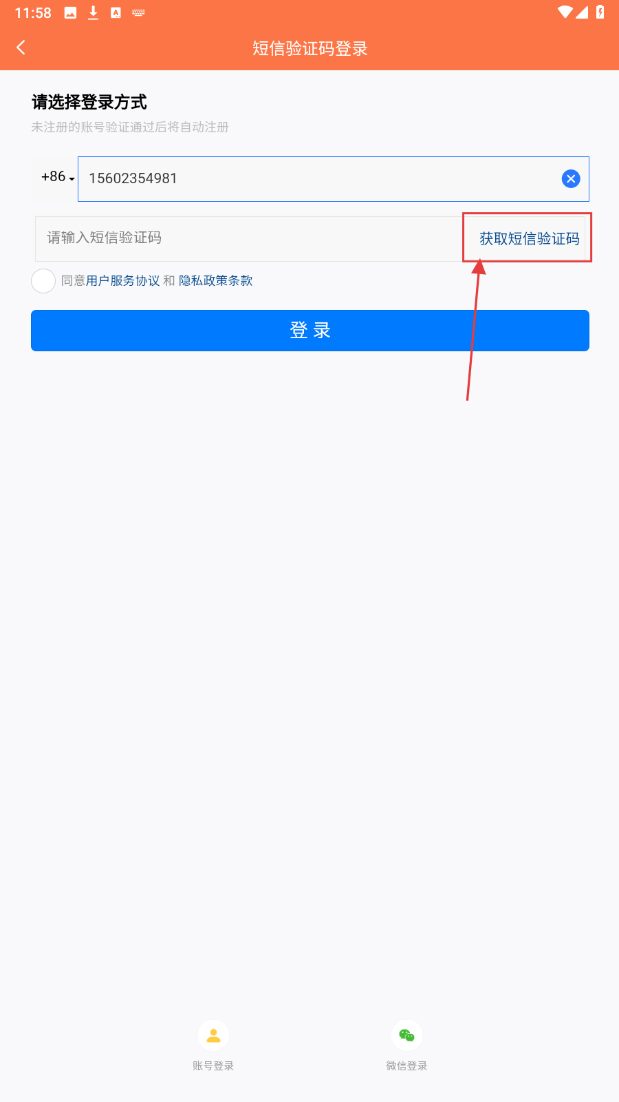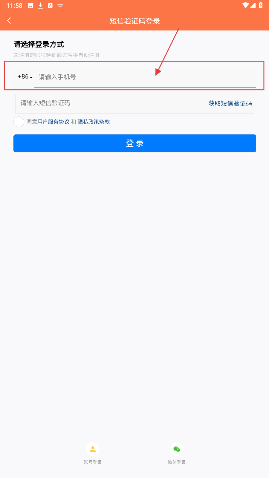 1、打开应用,进入短信验证码登录页,在【请输入手机号】框录入手机号。