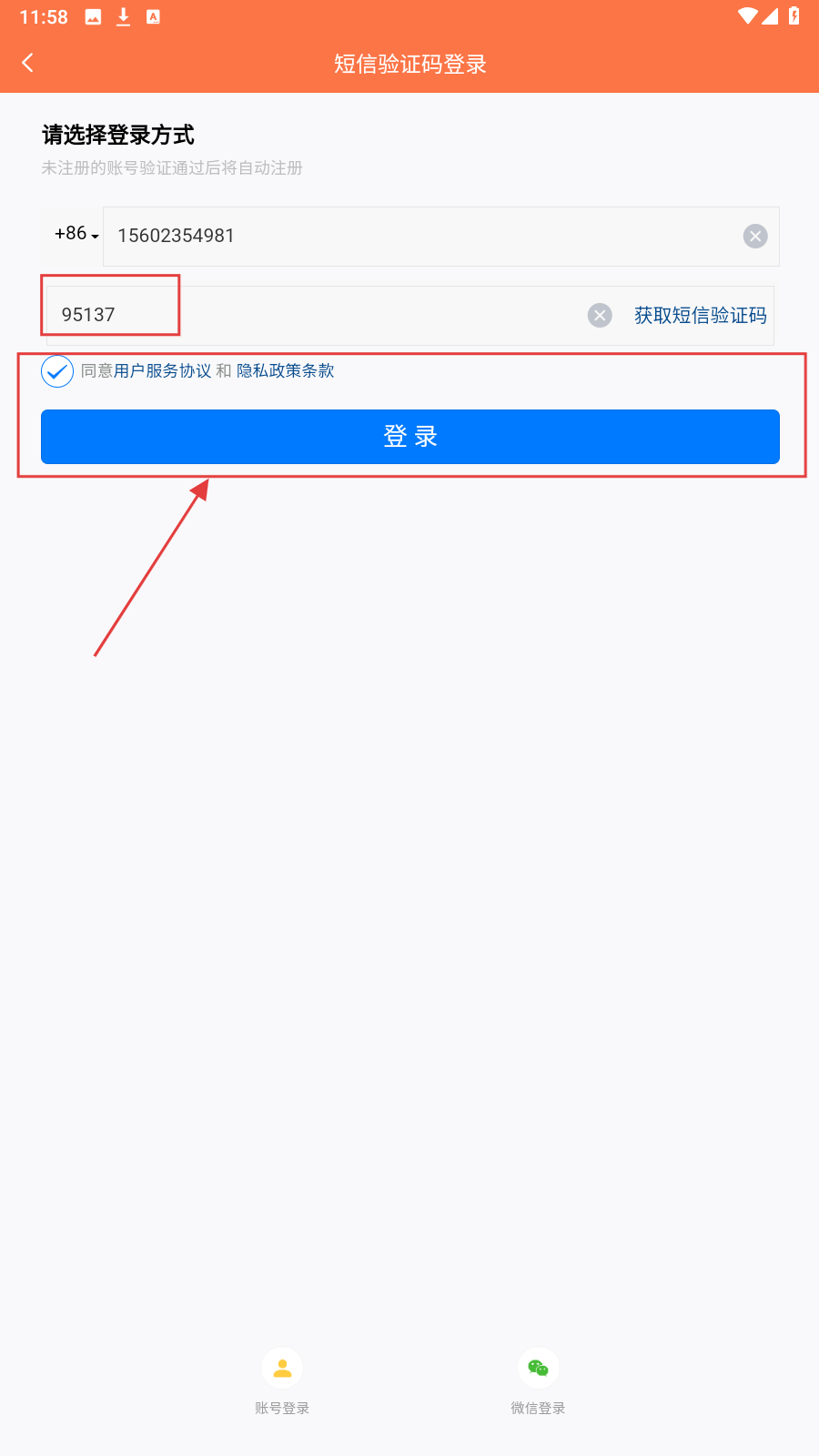 3、勾选【同意用户服务协议和隐私政策条款】,点击【登录】,完成登录流程。