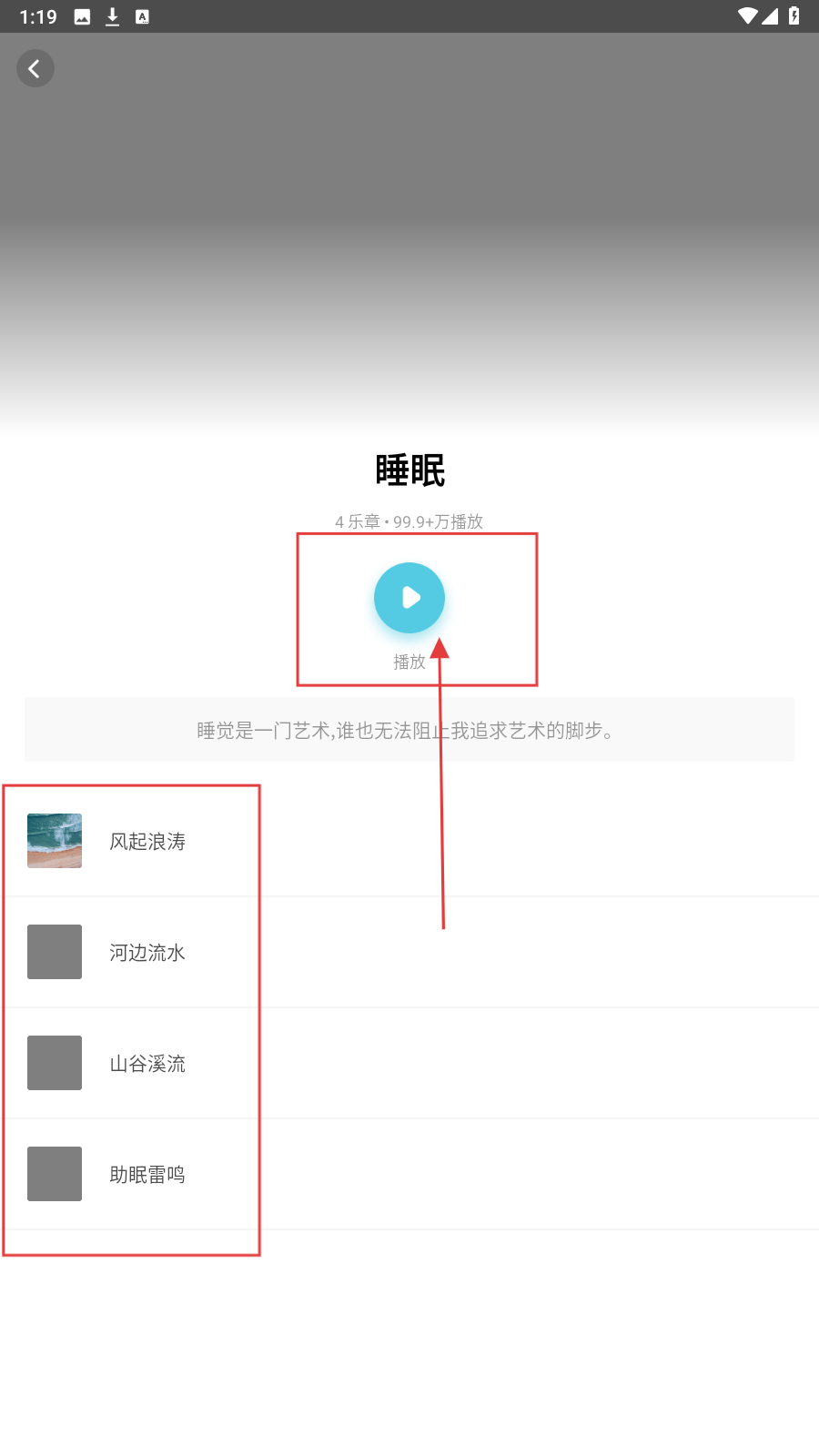 2、在睡眠场景详情页,点击【蓝色播放按钮】,可选择左侧列表【风起浪涛、河边流水等音频】,如选【风起浪涛】。