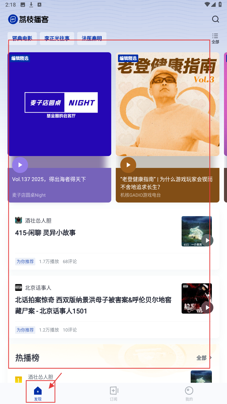 1、打开荔枝播客应用,进入【发现】页,点击感兴趣的播客分类标签或推荐播客封面。