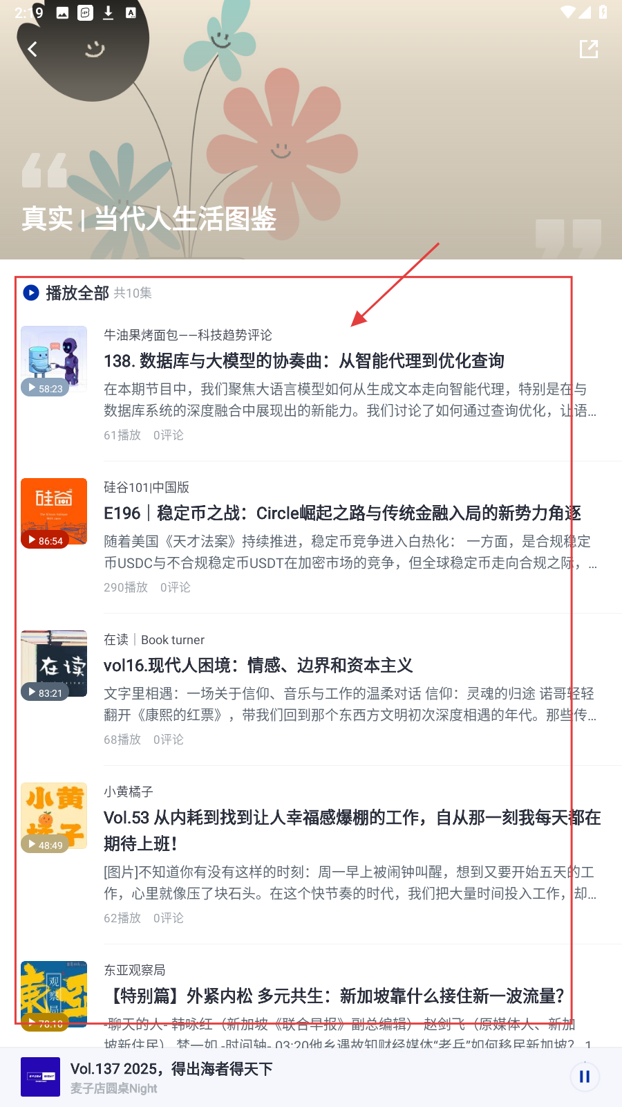 2、进入选中播客的详情页,查看【播客集数和单集列表】,点击想听的博客并点击。