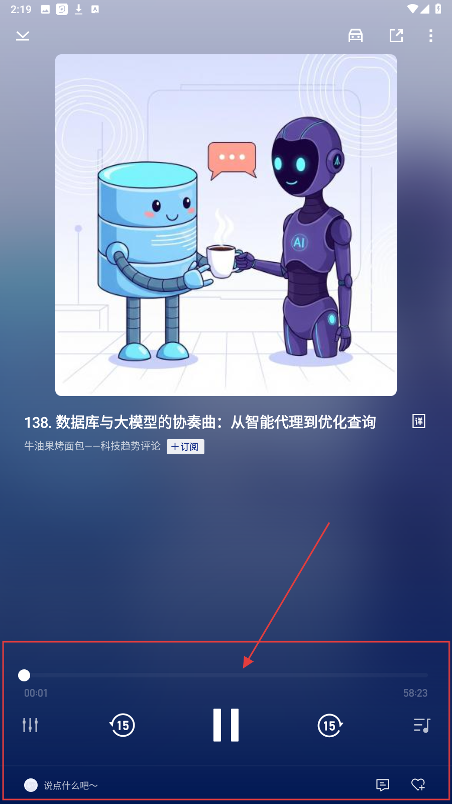 3、进入单集播放页,点击【播放按钮】开始收听,通过播放控制栏调整播放进度、倍速等,完成播客收听流程。