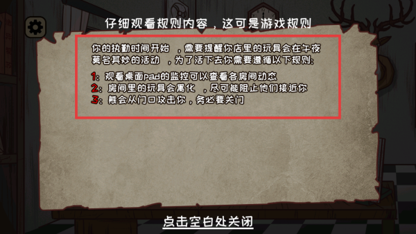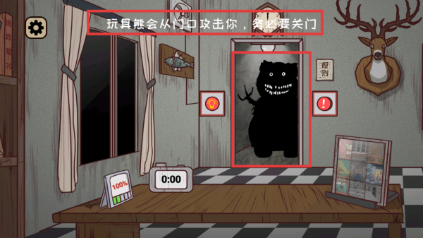 3、时刻警惕房间内黑化玩具接近,采取措施阻止;看到玩具熊出现在门口,迅速关门躲避攻击,保障自身安全,在午夜生存下来。
