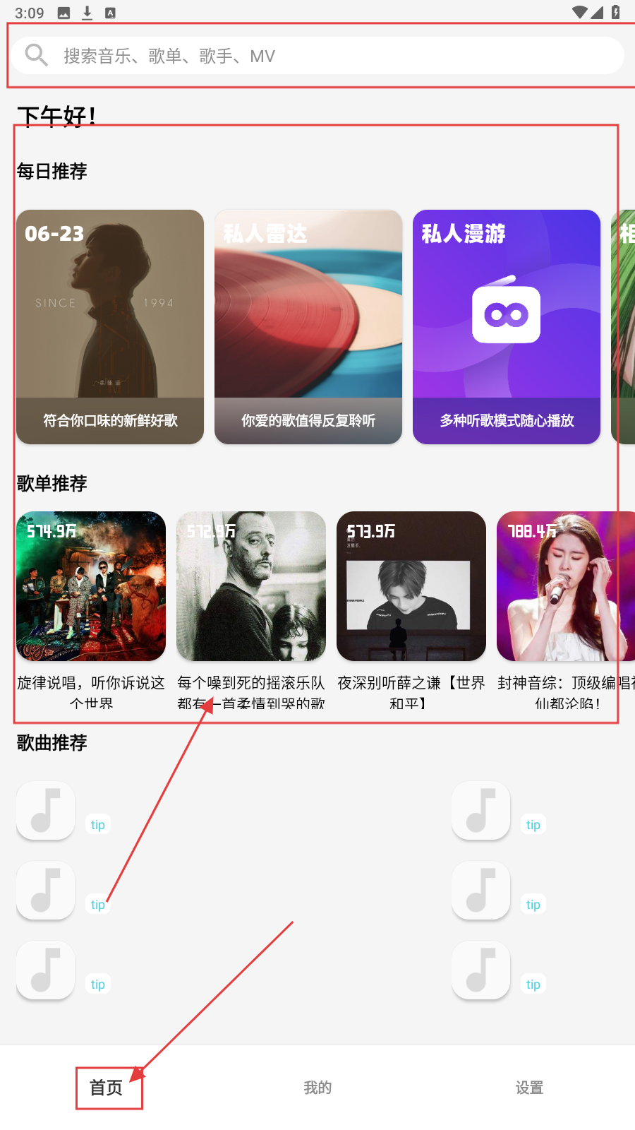 1、打开音乐应用,进入【首页】,浏览搜索栏、每日推荐、歌单推荐,点击感兴趣内容(如歌单)。