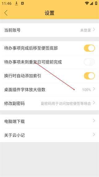 3、在设置页面,找到并点击【桌面插件字体放大倍数】选项,弹出字号选择弹窗。