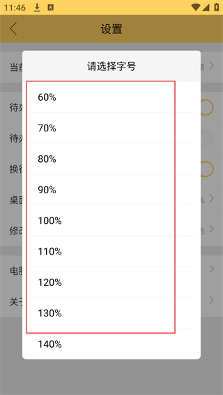 4、在字号选择弹窗中,选择目标放大倍数(可选范围为60%~140%),完成桌面插件字体大小的调整。