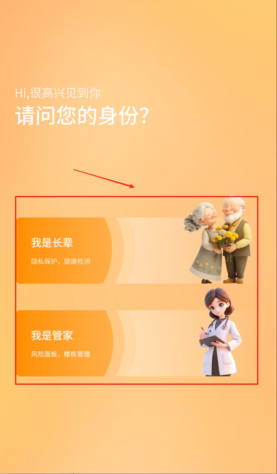 1、打开软件见到暖橙色页面,选"我是长辈"或"我是管家"按钮呀,健康监测和楼栋管理功能不同身份分开哦。