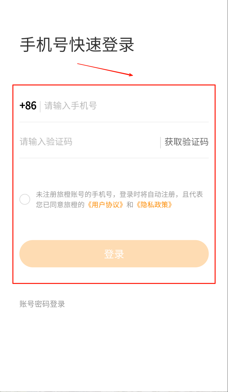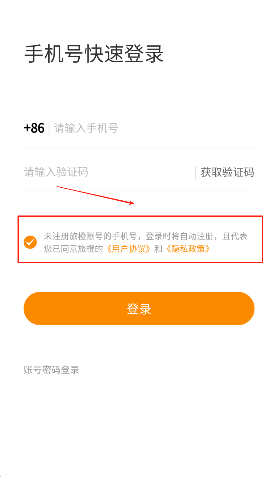 2、记得勾选下面那行小圆点,同意用户协议和隐私条款才能顺利登录,换短信登录就戳橙色"验证码登录"字啦。