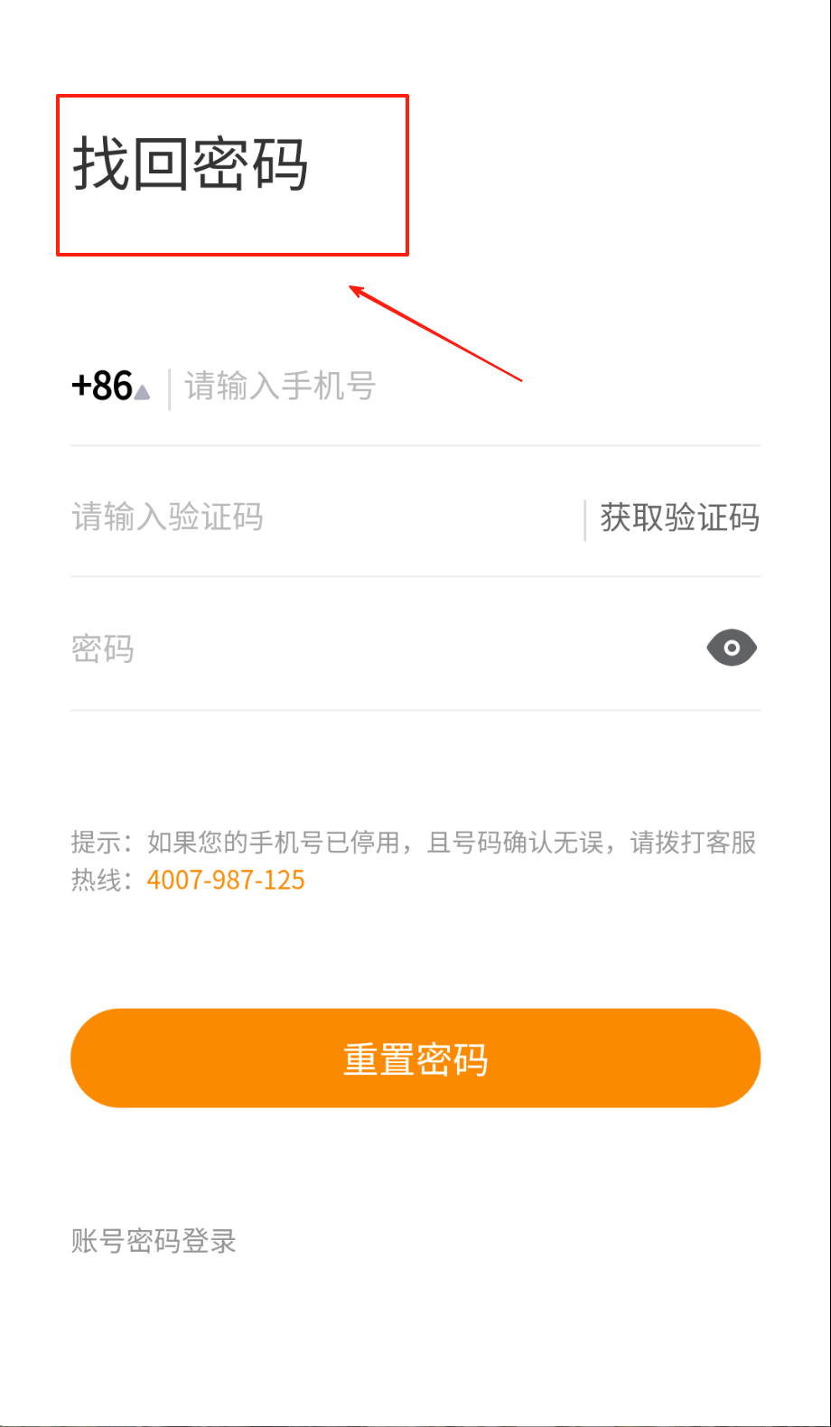 3、找回密码点底部灰色"忘记密码",填手机号收验证码,新密码设好点橙色重置按钮,手机停用就打4007987125呀。