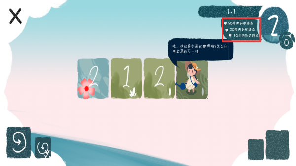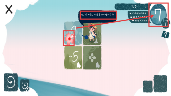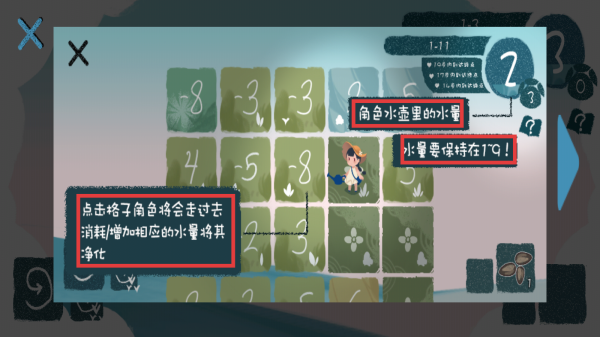2、关注格子数值,点击格子让角色移动,根据数值消耗或增加水壶水量,使水量保持在1-9。
