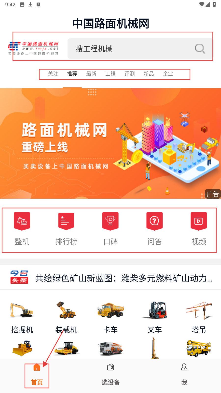 1、打开路面机械网应用,进入【首页】,可见搜索栏、分类标签、功能入口及设备推荐,点击对应模块使用。