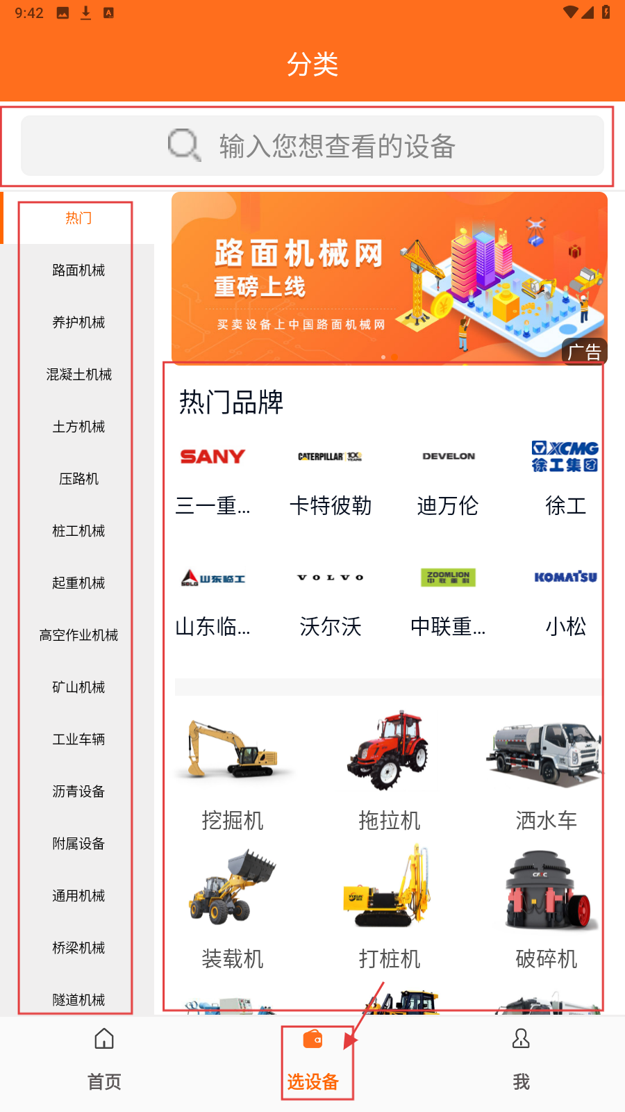 2、切换至【选设备】页,通过搜索栏或左侧分类、热门品牌、设备类型查找目标设备。