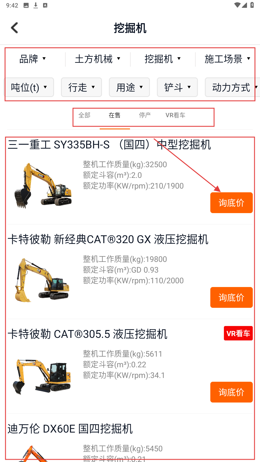 3、进入具体设备列表页,利用筛选条件、状态标签精准筛选,点击设备【询底价】按钮,即可进行设备查找及询价流程。