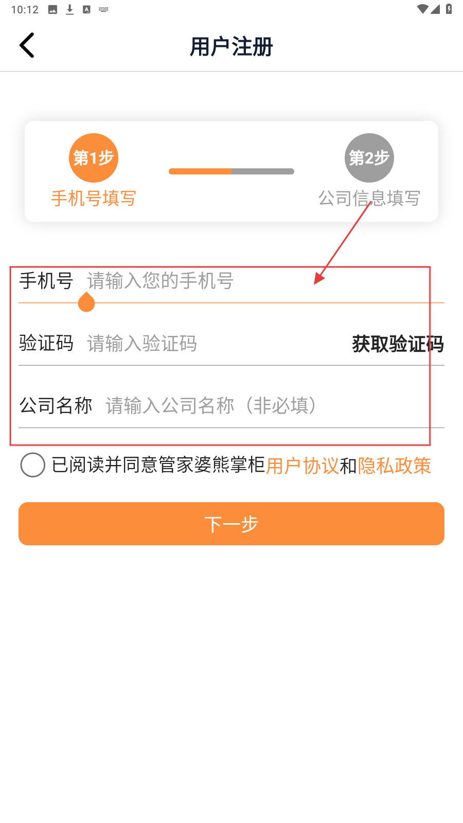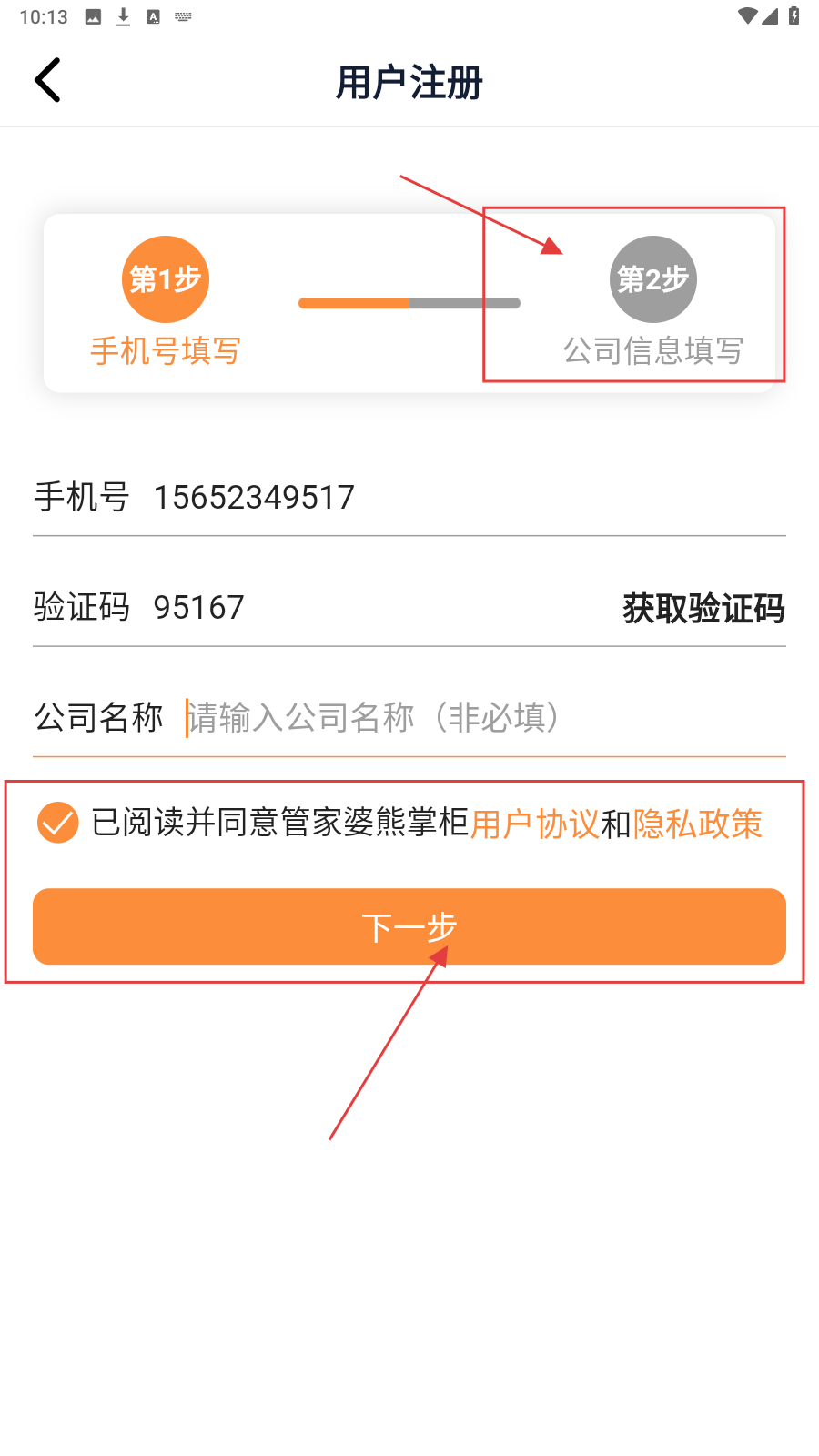2、在【用户注册-手机号填写】页,录入手机号,点击【获取验证码】,录入验证码按需填写公司名称,勾选协议。