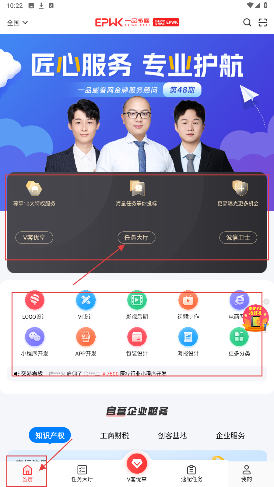 1、打开APP,进入【首页】,可见服务入口(LOGO设计等)、业务板块(自营企业服务等),点击【任务大厅】。