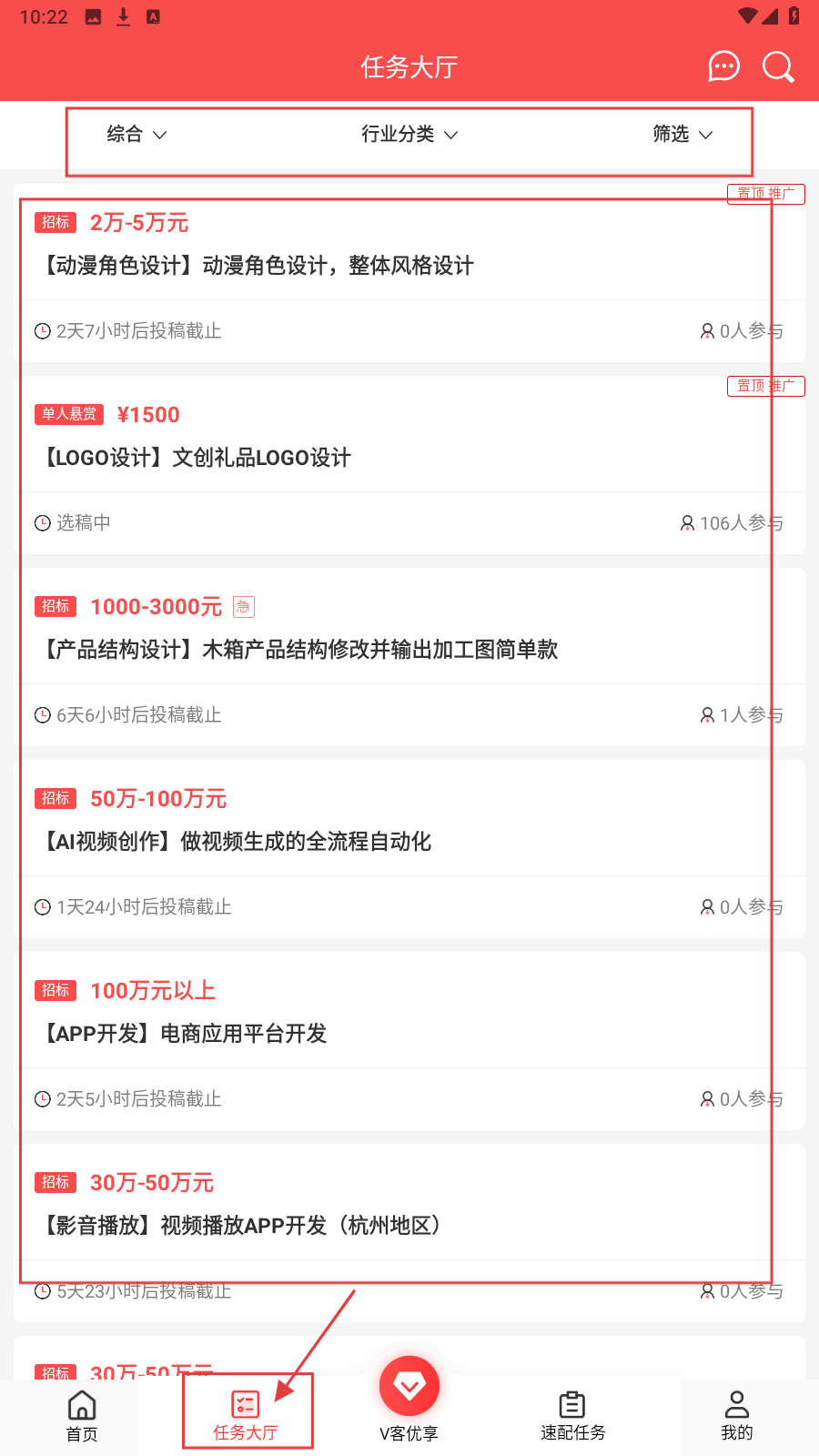 2、在【任务大厅】,通过综合、行业分类、筛选条件,浏览任务列表,选择目标任务。