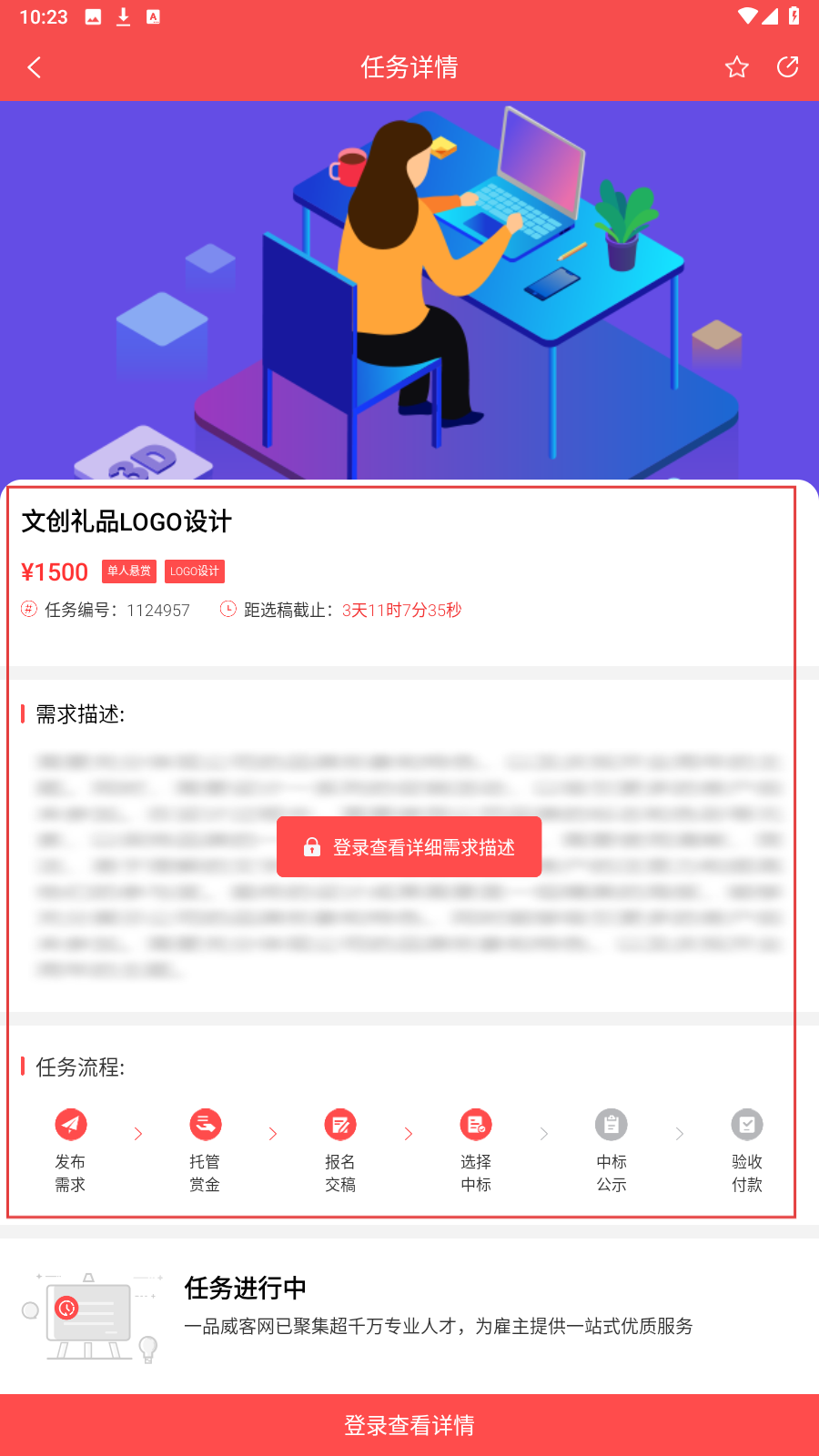 3、进入【任务详情】页,查看任务信息,点击【登录查看详细需求描述】或【登录查看详情】,即可查看。