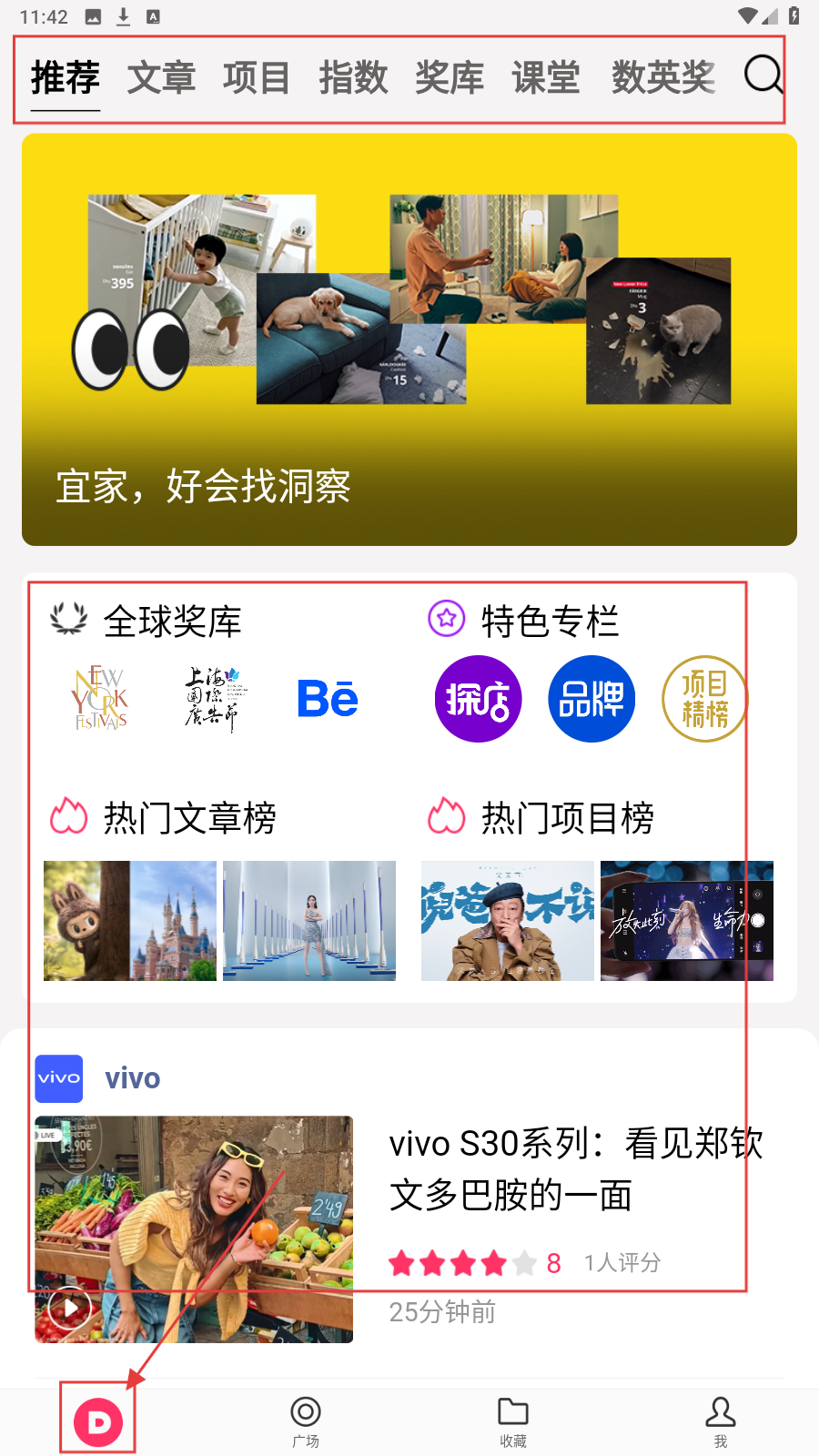 1、打开APP,进入【数英】首页,可见导航栏(推荐、文章等)、内容板块(全球奖库、热门文章榜等),点击底部【广场】。