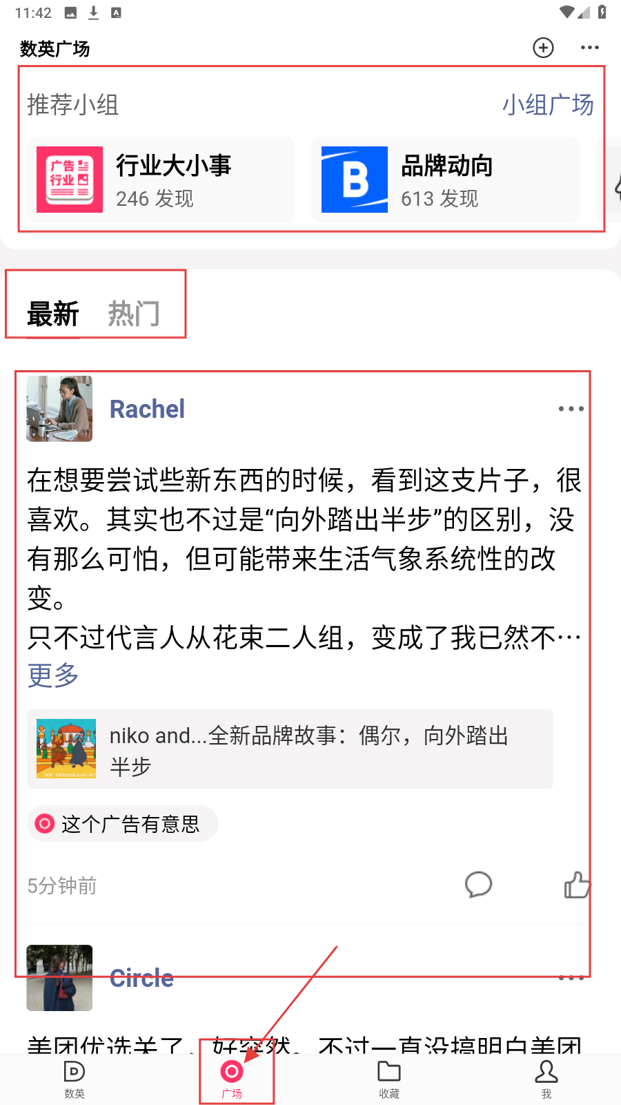 2、在【数英广场】,可见推荐小组(行业大小事、品牌动向)、内容分类(最新、热门)及用户动态,浏览广场内容。