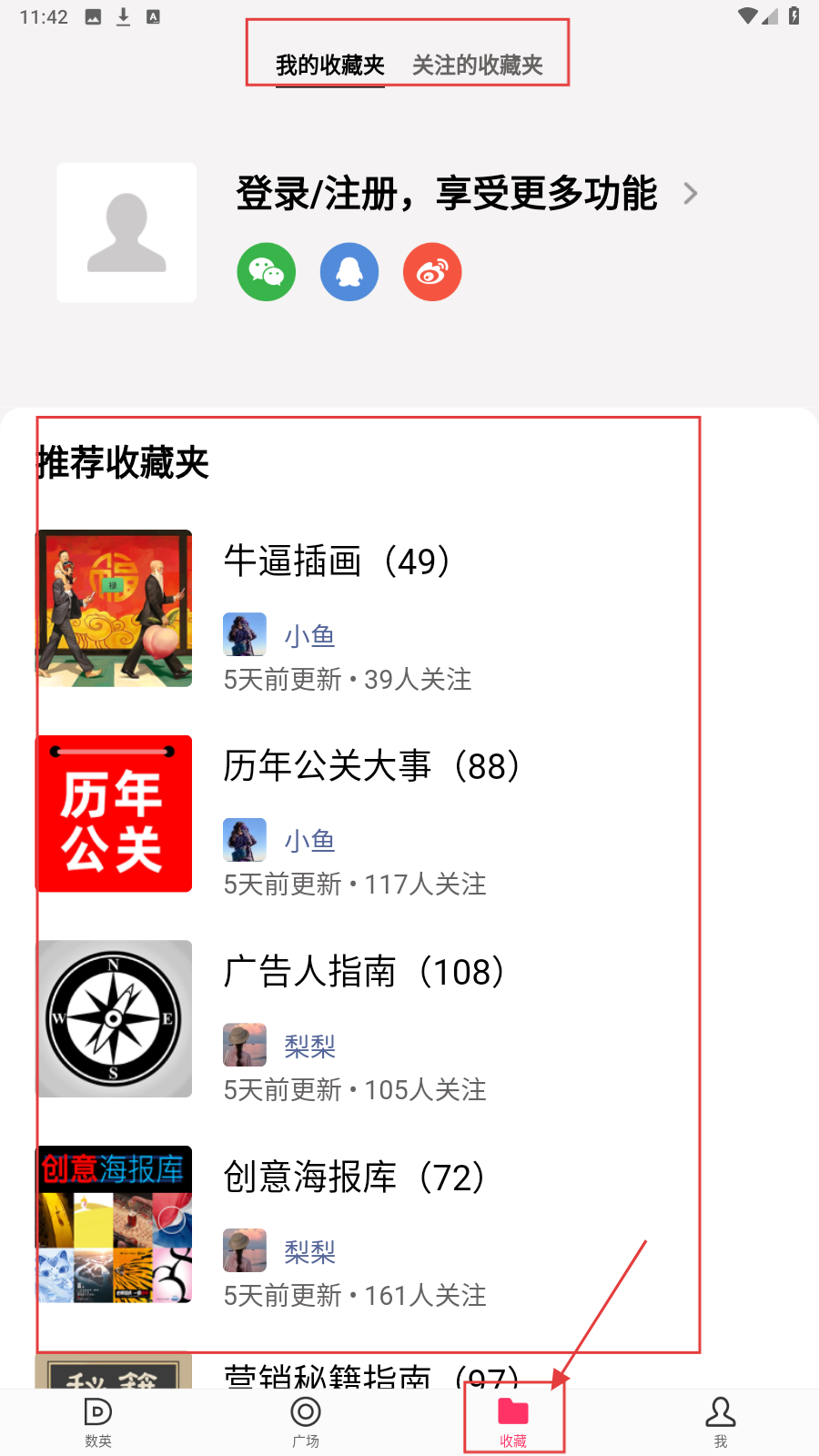 3、点击底部【收藏】,进入【我的收藏夹】页,查看推荐收藏夹,登录后即可进行收藏。