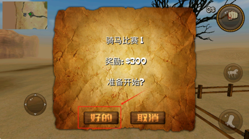 3、如何开始比赛?在游戏界面中,点击“好的”按钮,选择“骑马比赛1”,并点击“好的”确认开始比赛,准备开始游戏挑战。