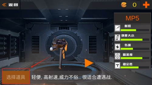 2、如何选择装备?在主菜单中,点击“商店”按钮进入装备选择界面,选择适合你的武器,如MP5,查看其属性并进行选择。