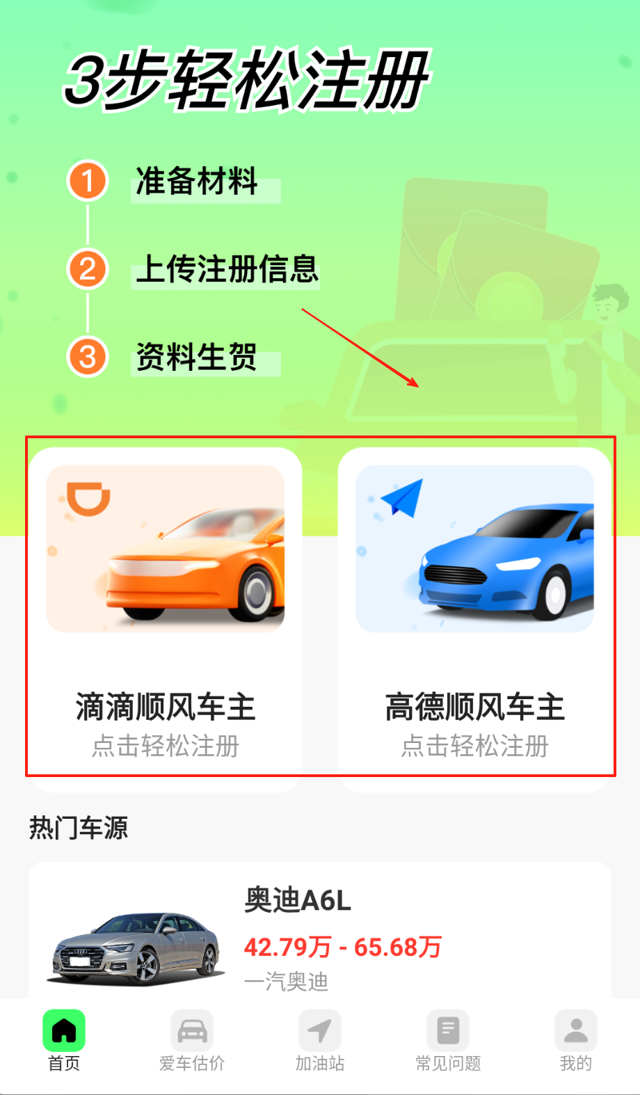 1、首页点"极速注册"上传驾驶证行驶证,AI自动识别信息同步至6大平台,人脸核验10秒完成资质审核哦。