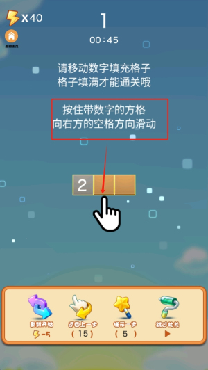 2、进行游戏操作:在游戏过程中,按住带数字的方格向空格方向滑动以填充格子。