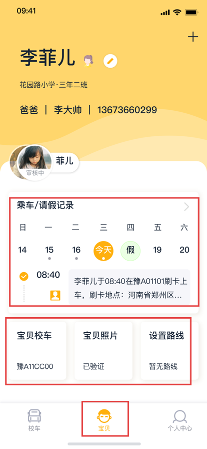 3、切换到【宝贝】页面,查看李菲儿信息、乘车/请假记录、校车及照片等设置,完成校车服务功能体验流程。